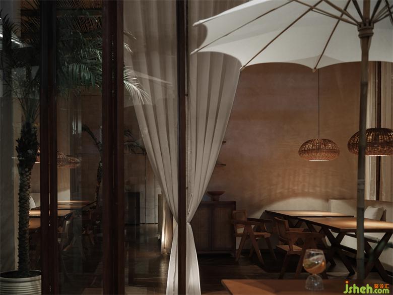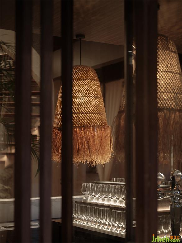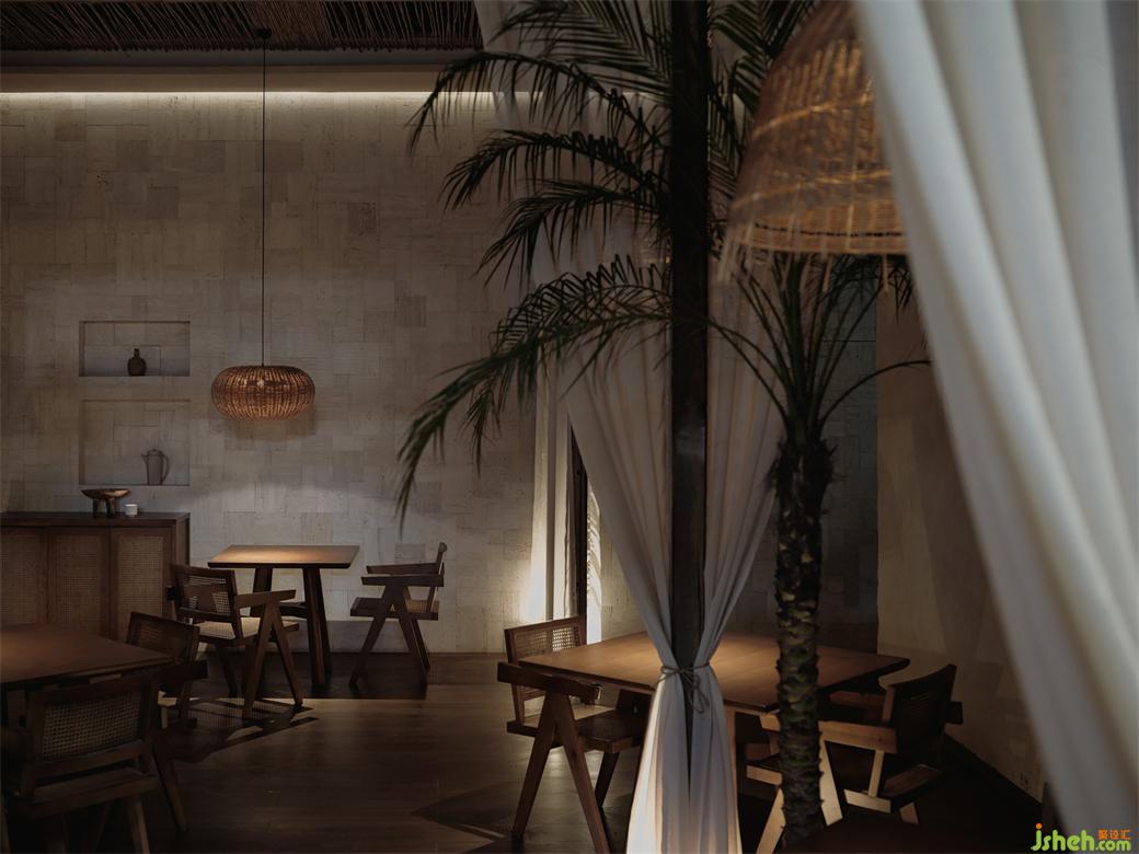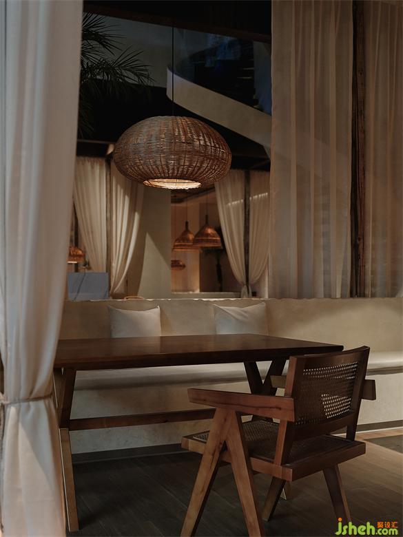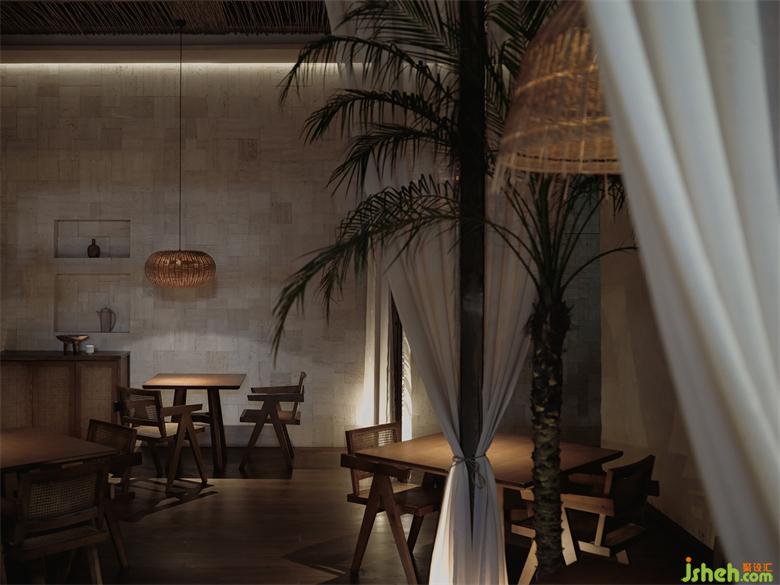 紗幔頂部的蘆葦桿屋頂,除了增添空間的自然質(zhì)樸質(zhì)感之外,亦是一種可持續(xù)性的設(shè)計實踐。泰爽餐飲設(shè)計讓一切交織在一起,形成一幅靜謐舒適而又清新自然的浪漫寫意畫。