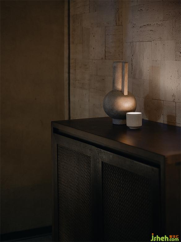 After passing through the wooden porch and outdoor seating area, entering the interior space, the entire space is wrapped in a mild sand-colored inorganic gray plaster wall. The slightly yellowish light shines through the gaps in the rattan lamps, leaving thin and long textures on the wall. The alternating separation and connection of different space areas balance the essential needs of privacy and openness in the restaurant.