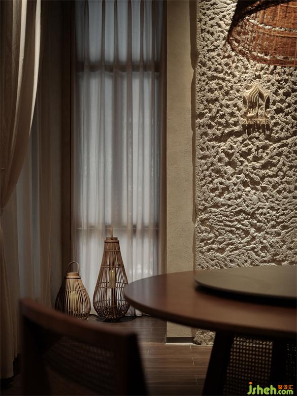 On one side of the private room is a richly textured mosaic stone wall, and on the other side is a granular slate. Under the even washing wall lights, it presents a unique light and shadow texture.