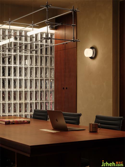 石質(zhì)臺(tái)階結(jié)合玻璃磚墻,劃分出較為私密的辦公空間。該空間也對(duì)到訪的客人開放。極簡(jiǎn)一字型馬扎燈帶來(lái)均勻的光線,冷靜但又溫暖。橫平豎直的管線和書柜、玻璃磚形成了視覺上的呼應(yīng)。