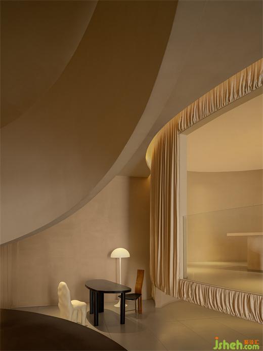 The whole space was softly enveloped by curtains, the main tone of the design, making the whole space more comfortable. “Fabric”, serving as the medium of communication, gets in touch with the intimate territory of the soul by its soft texture and form. We desperately need a quite corner for soul projection and self-fulfillment when we are facing ubiquitous emotions. Here, visitors can totally free them from the noisy world, experiencing love and serenity in the gentle and tranquil space. That’s the purpose of the designer.
