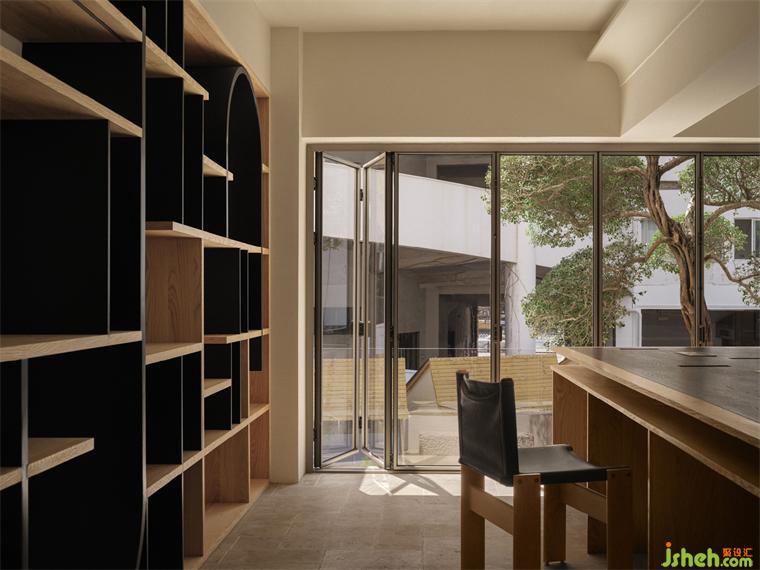 Inside, however, a new airy and open space was created by dividing the space into a series of modular sections and removing the load-bearing walls in the original structure. On the south side, an extended terrace and outdoor display space have introduced more natural light in, which allows the previously enclosed environment to connect with nature. Through the influx of light, the essence of spring is evoked, and the passage of time is captured in the playful movements of the light.