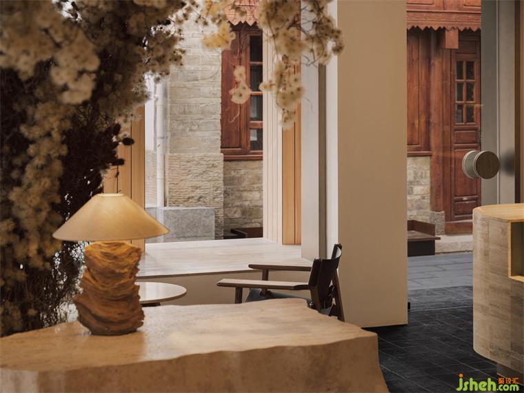 Sunlight filters in through the glass doors on two sides, bringing the energy of spring into the interior space. It climbs up the stone ledges, delicate branches sprout and bloom as spring arrives; It reaches beyond the wood and stone, the fragrance of tea permeates the air, gently enveloping the essence of spring.
