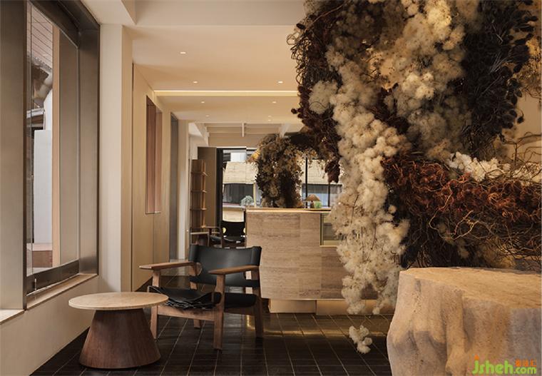 由大型的藝術裝置導入內部空間,讓參觀者在初入空間時就能感受整體的氛圍,輕松而愜意,如沐春風,猶聞花香。裝置靈感來自于曠野的大自然,盤根錯節(jié)的植物根系。這些天然的元素被柔軟地包裹著,蔓延著。轉身而過,木質吧臺溫柔的棲息在你的周身,這里不止售出石頭的藝術也販賣美味的典藏。