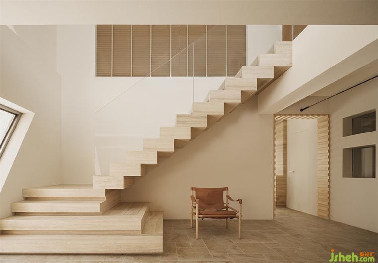 二樓與三樓連接處的樓梯,內(nèi)斂而安靜的色調(diào)搭配簡約的幾何造型,將空間中平衡溫和的聲量放大,并延續(xù)至三層。三層主要作為主理人的辦公空間和開放的VIP空間使用。