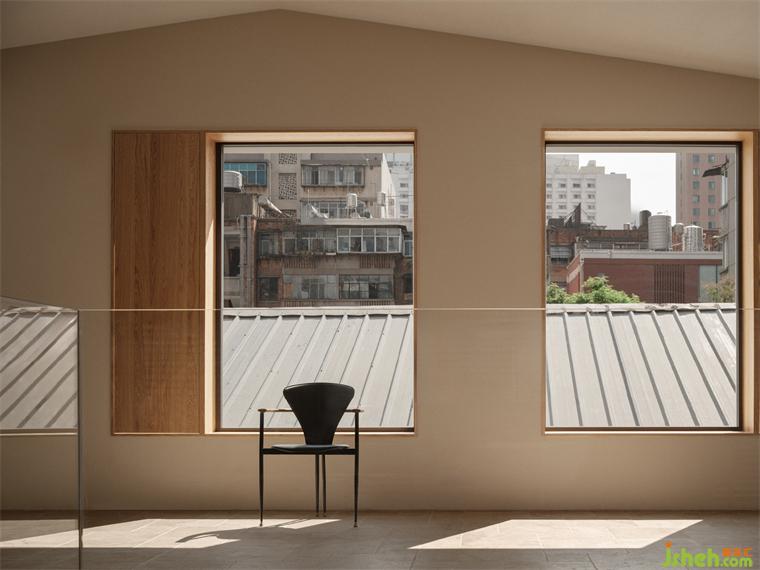設(shè)計(jì)師在三層的設(shè)計(jì)中用了大量的矩形開窗,導(dǎo)入更多的自然光線,辦公室頂部的天窗,明亮但聚焦的光線滿足珠寶辨識的需求;飄窗里直白明麗的光線讓視覺與景觀連接;而南面大面積的玻璃磚,讓正午傾瀉而下的陽光更和煦溫柔;西面的側(cè)窗,光線隱秘而溫和,將攝影室的私密性完整烘托。