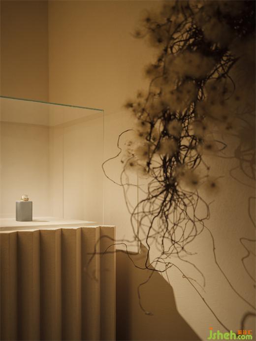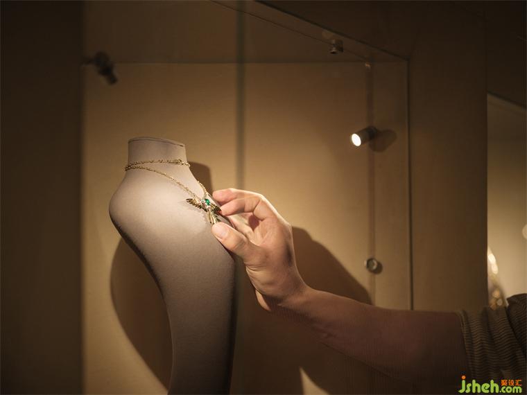而在室內(nèi)的顏色表達(dá)中,大量的暖色調(diào)及中性色的加入,珠寶展廳設(shè)計(jì)讓平衡、溫暖、沉靜的空間主題呼之欲出,以珠寶作為中心表達(dá),減弱色彩的運(yùn)用。