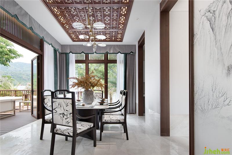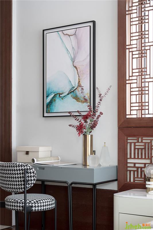 韋美在玄關(guān)和餐廳的處理上,大膽選擇雅致水墨畫(huà)來(lái)中和整個(gè)空間,用來(lái)打破過(guò)于繁瑣的硬裝造型所帶來(lái)的沉悶。餐廳以當(dāng)代美學(xué)格調(diào)的構(gòu)圖與鋪陳,凸顯設(shè)計(jì)筆觸之下的意境之美。
