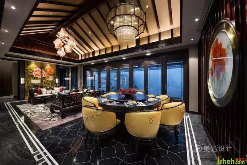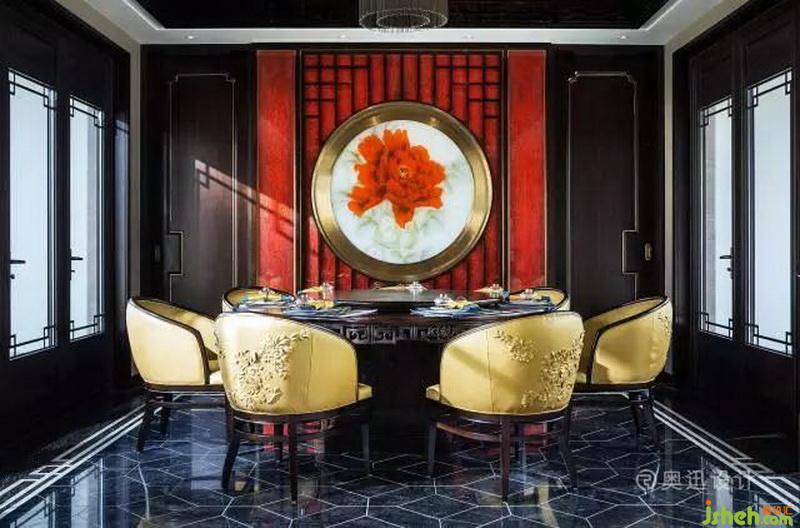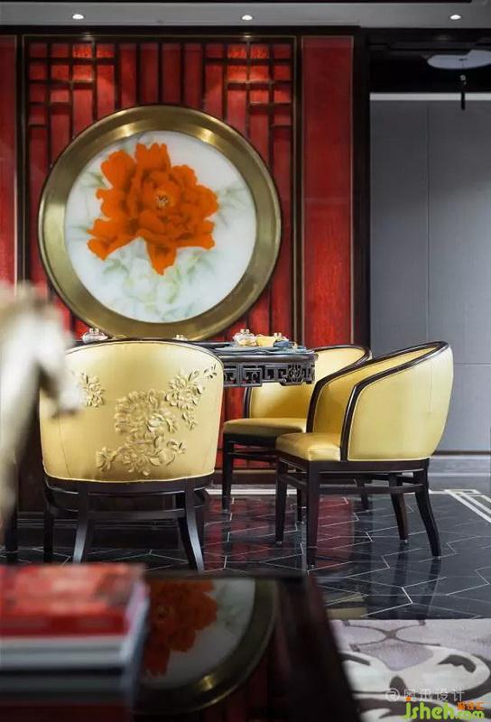 現(xiàn)代設(shè)計的牡丹花吊燈與背景的牡丹夾絹交相輝映,色彩與廚房的隔斷木格屏風(fēng)形成巧妙聯(lián)結(jié)。紅色的樹脂墻身傳遞著中國紅的視覺能量,形成獨(dú)具一格的空間感。與之對應(yīng)的青花瓷擺件亦增加了空間的收藏歷史意味。