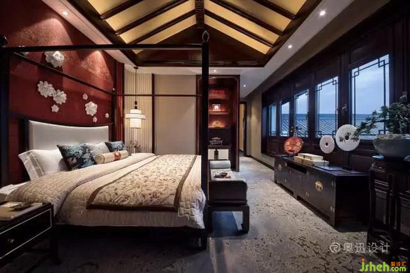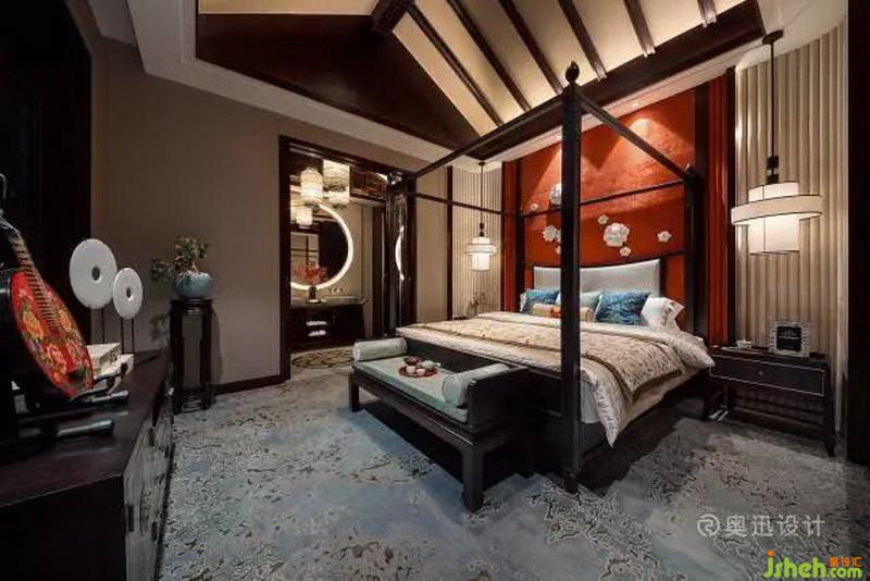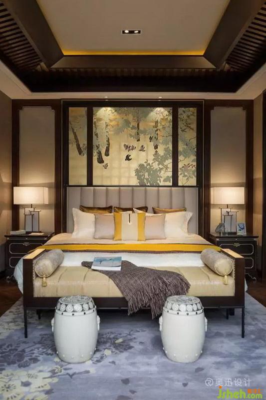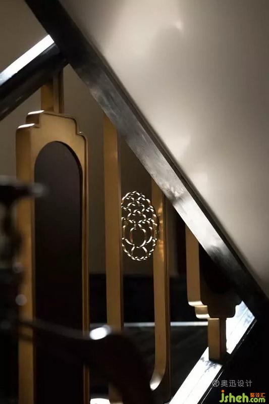 以不同灰度相融調(diào)節(jié)視覺調(diào)性,強(qiáng)調(diào)舒適感,床頭的手繪墻紙再次唱響“牡丹”主題,在中式吊燈的映襯下,盛開得格外艷麗;私密的臥室沿襲了整體空間的清雅與平和,空間色彩、形式,無一不在提示著過去、現(xiàn)在,東方人文的演變與糅合。
