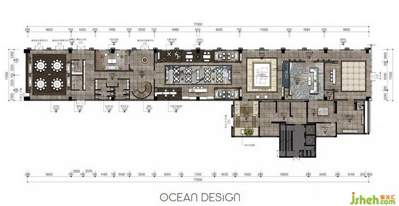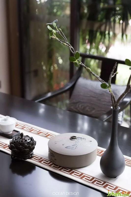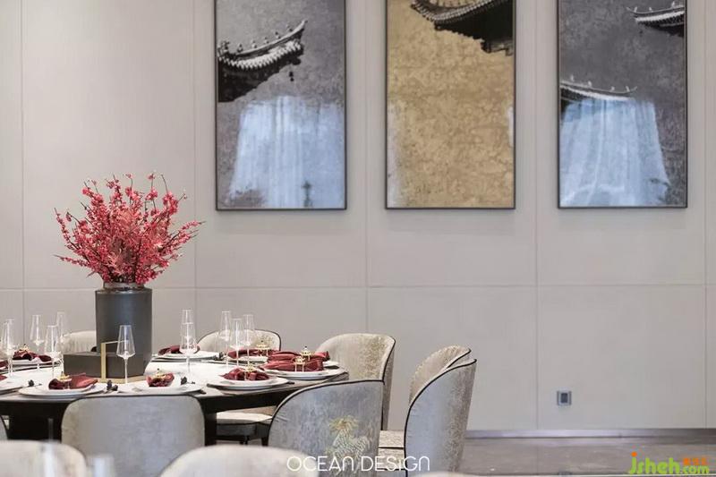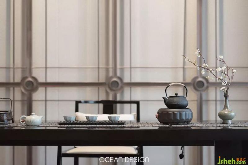 道家認為:“天圓”心性上要圓融才能通達;“地方”命事上要嚴謹條例。活動室的設(shè)計于此為理念,將兩側(cè)對應的不銹鋼背景“圓形”造型與“方形”天花進行理性地組合,創(chuàng)造出自然獨特、和諧的美?!鞍氡谏椒看髟?,一盞清茶酬知音”,茶室的設(shè)計是設(shè)計師給賓客構(gòu)建一方悠閑的天地,讓身處其中的人在談笑間感受自然,并與之共鳴。