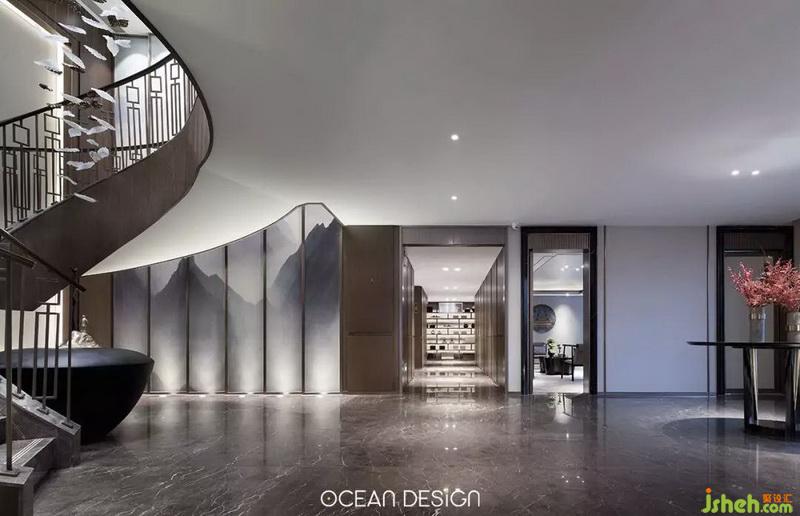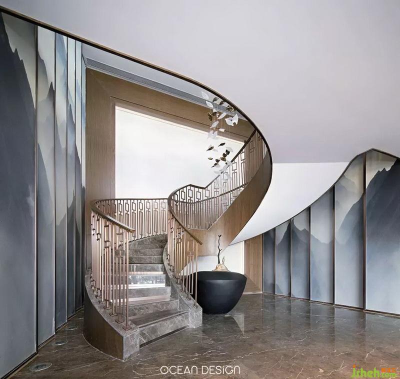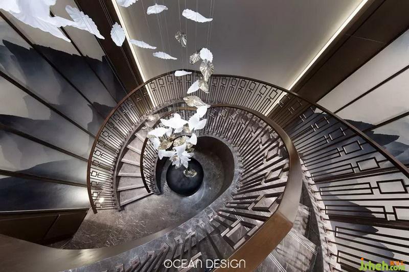 設(shè)計師在樓梯整體造型上做了巧妙構(gòu)思。古銅色不銹鋼造型極具雕塑感的視覺沖擊,結(jié)合水晶質(zhì)感的抽象化飛鳥群,繪出一幅鳥兒歸巢的畫卷,自上而下如同光影,清淺之中,自成景觀。