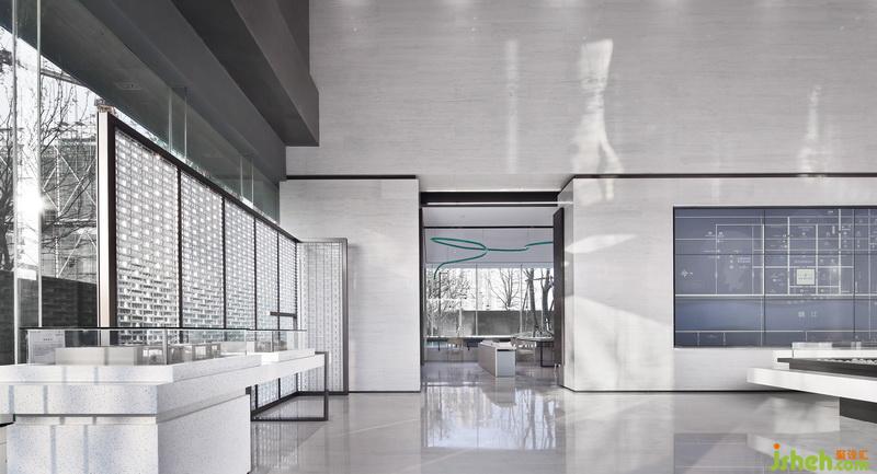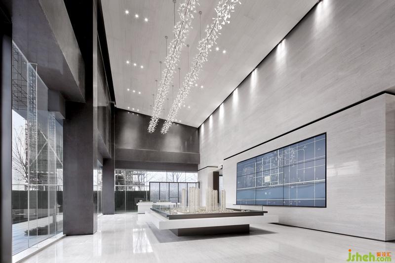 拔高的空間素凈透亮,設(shè)計(jì)提取水的千姿百態(tài),或靜或動(dòng),或剛或柔,為空間帶來(lái)婉轉(zhuǎn)起伏之美。沙盤(pán)宛如贛江中搖曳的船只,吊燈垂落似輕盈流暢的江水,相互交織,非常具有畫(huà)面感的空間構(gòu)造,流露出來(lái)的是對(duì)隱逸山水的那份傾心。