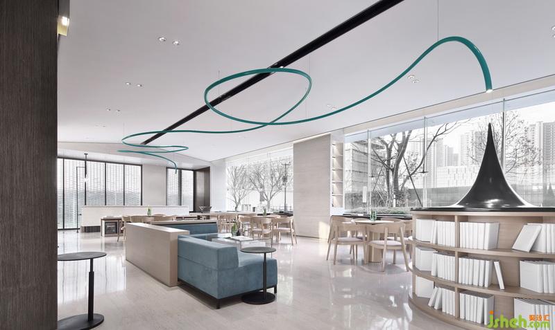 咖啡書(shū)吧的天花上,設(shè)計(jì)師用一條飄蕩的藍(lán)色水帶徜徉于空間中,邀請(qǐng)每一位來(lái)訪者入座,共赴一場(chǎng)當(dāng)代曲水流觴的文化之旅。