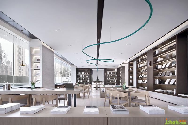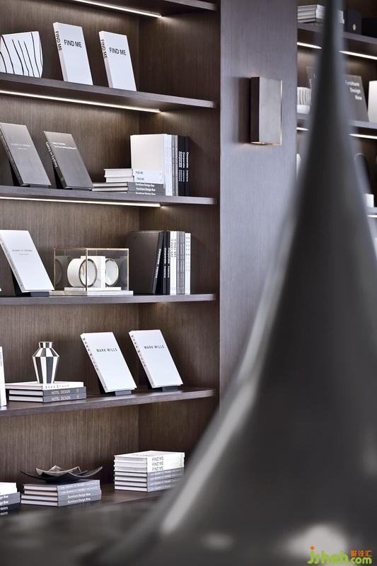 疏朗簡(jiǎn)凈的現(xiàn)代語(yǔ)言,與書(shū)柜上方水滴裝置相結(jié)合,仿佛涓涓流水匯聚成形,寓意浩瀚的書(shū)籍世界。