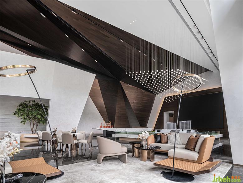 接待大廳以鏡面不銹鋼與幾何金屬防火板的碰撞融合,構(gòu)成空間的多維度群山造型呈現(xiàn)。沉穩(wěn)的大理石在廣博的紋理中,嵌入黑金漸變的色調(diào),婉若天空微亮前的山巒金頂,使觀者置身其中,產(chǎn)生對(duì)歷史記憶的共鳴。