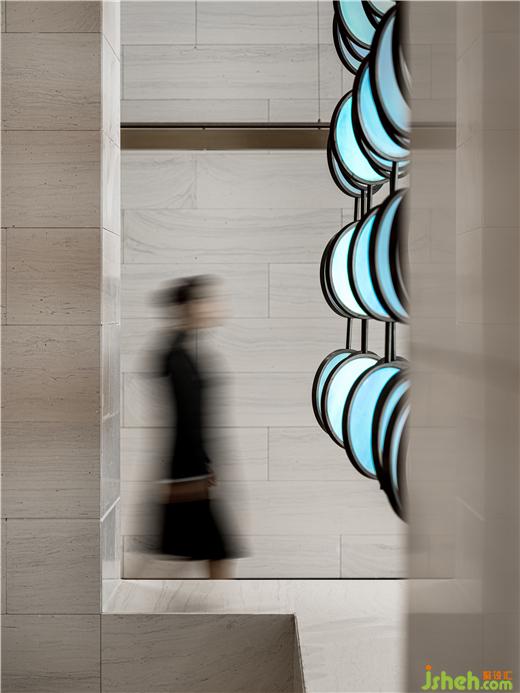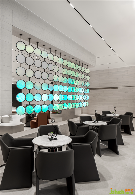物理式的意象串聯(lián),引出內(nèi)在的精神回響。將多個圓形的幻彩玻璃在空間中不斷重復(fù),陣列,堆砌,形成似隔非隔的屏風(fēng),售樓部設(shè)計在視覺與聽覺的交融中,奏響圓融中暗含鋒芒的智慧。