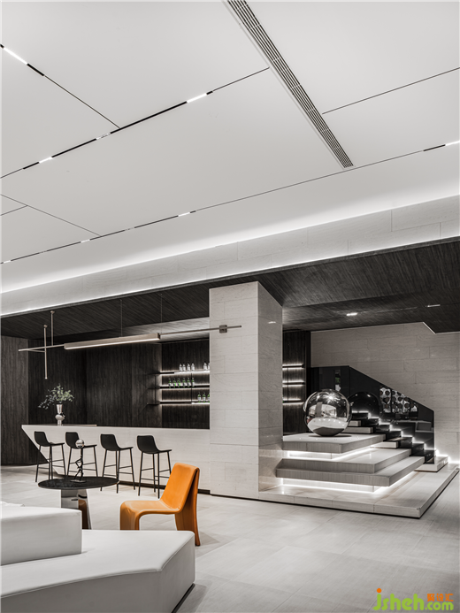售樓部設(shè)計以光為媒介,清冷的不銹鋼鏡面材料的運用,以一種可感知的立體形態(tài)起承轉(zhuǎn)合,組成藝術(shù)樓梯的極簡美學(xué)要素,與上下樓梯的觀者在動靜之間互動,帶來視覺的多重感官享受。