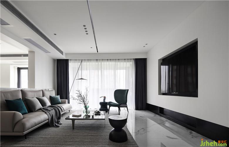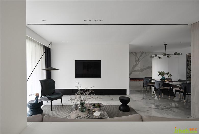 舒適的空間允許不按順序地呈現(xiàn)。室內(nèi)設計師不再遵循傳統(tǒng)、單一的空間形態(tài),我們將非承重墻的一部分打開,創(chuàng)造出一個半墻結構。收攬室外風景入室,增加生活的互動,既相互獨立又緊密連接。天花板設計內(nèi)嵌黑色的線條造型,層次感強化視覺效果。