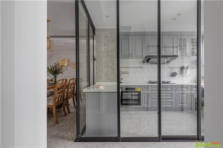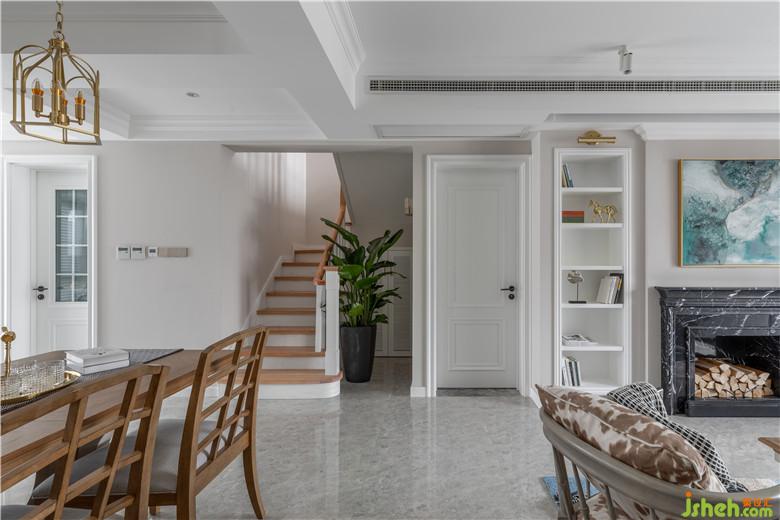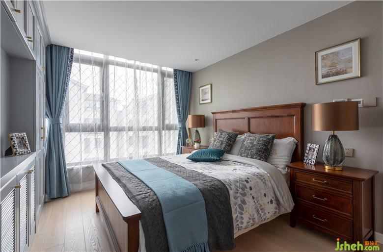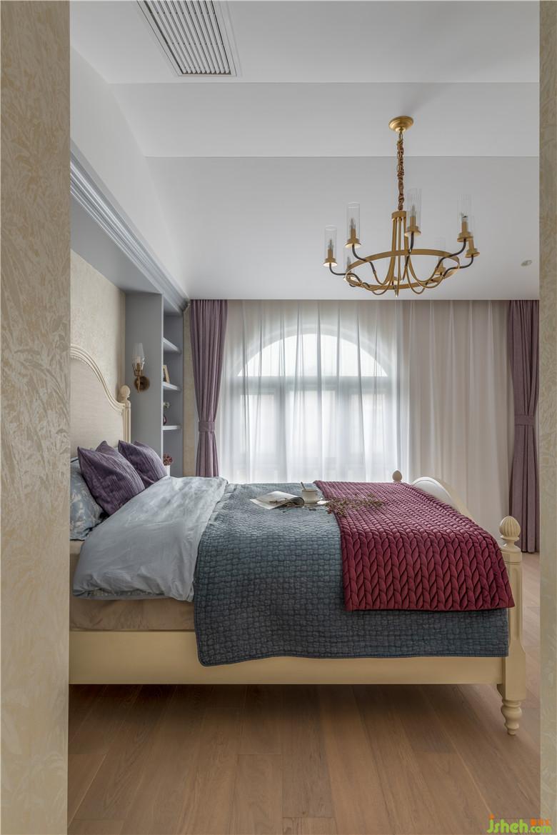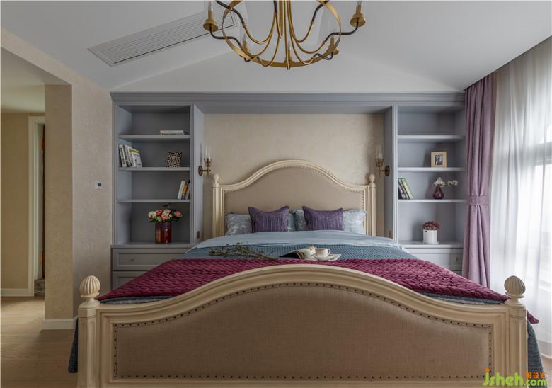 男女主喜歡在睡前翻閱一些書,因此室內設計師沒有選擇成品床頭柜,而是根據(jù)他們這個生活習慣設計了對稱書架式床頭柜,有充足的空間納入孩子的相片、常用書籍、助眠香薰蠟燭等等物件。色調上尊重了女主喜歡的紫色系,營造浪漫的休憩氛圍。