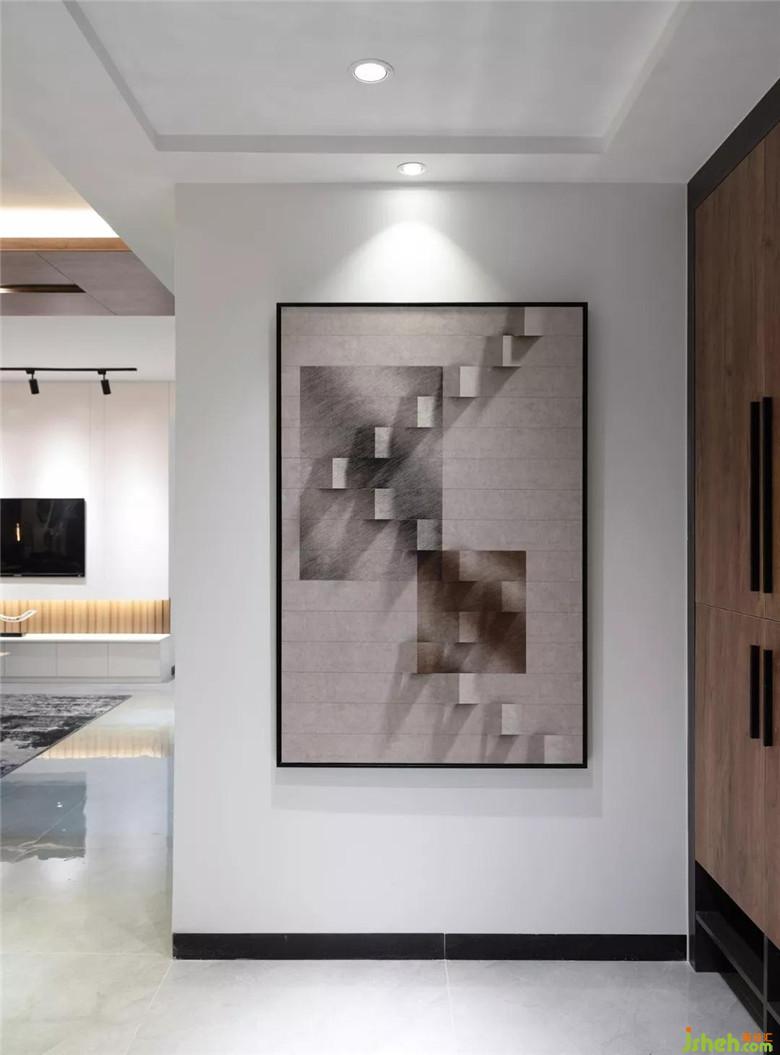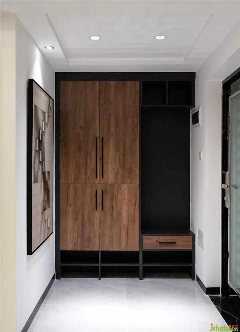 入門處的玄關(guān)氣質(zhì)典雅,抽象的掛畫在3㎡的空間里,氣韻低調(diào)奢華;原先的玄關(guān)鞋柜設(shè)計老舊,改造后的玄關(guān)增加1586mm定制柜,柜面的木頭紋理,樸實而細(xì)膩,柜子不但沒有遵循常規(guī)鞋柜設(shè)計,還結(jié)合生活行為設(shè)置方便穿鞋的地方。裝修設(shè)計