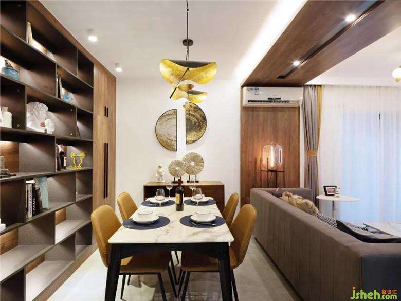 餐廳和客廳在同一空間,卻不顯突兀??蛷d與餐廳天花中間的木質(zhì)吊頂,讓客餐廳功能區(qū)分更加清晰。餐桌上方的燈是業(yè)主淘回來的復(fù)古吊燈,金屬的銅片,暖黃的燈光,是一份歸家的安心。設(shè)計師新設(shè)計了木質(zhì)紋理的置物架,打造充滿質(zhì)感的落地書架,可以放置書籍和業(yè)主從世界各地淘回來的展示品。裝修設(shè)計