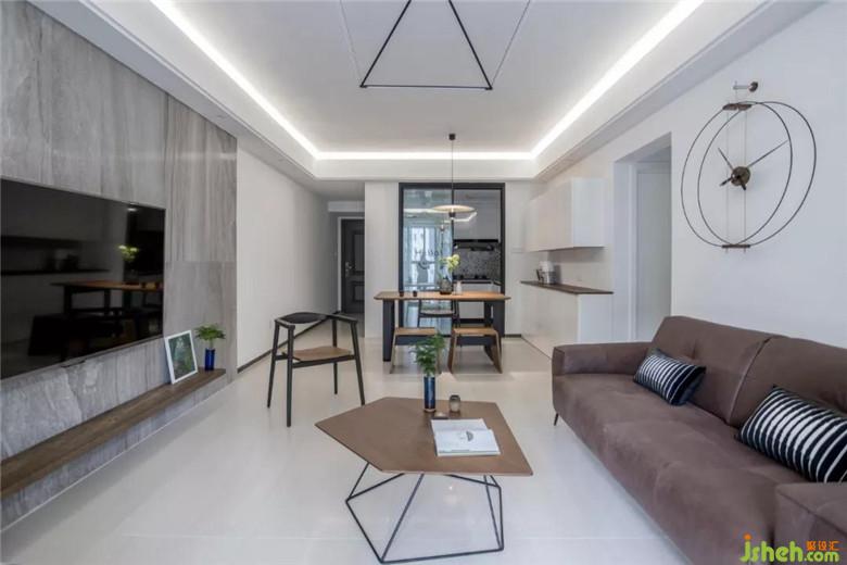 客廳陳列簡單,簡潔柔和的線條感簡化空間,看上去簡單大氣。軟裝設(shè)計中以男性的心理視角整體基調(diào)選用了冷色調(diào),淺色高級灰給人清冽硬朗的感覺,簡單的家居時鐘以及裝飾吊燈都在以極簡單的線條和質(zhì)地,突顯時尚感。