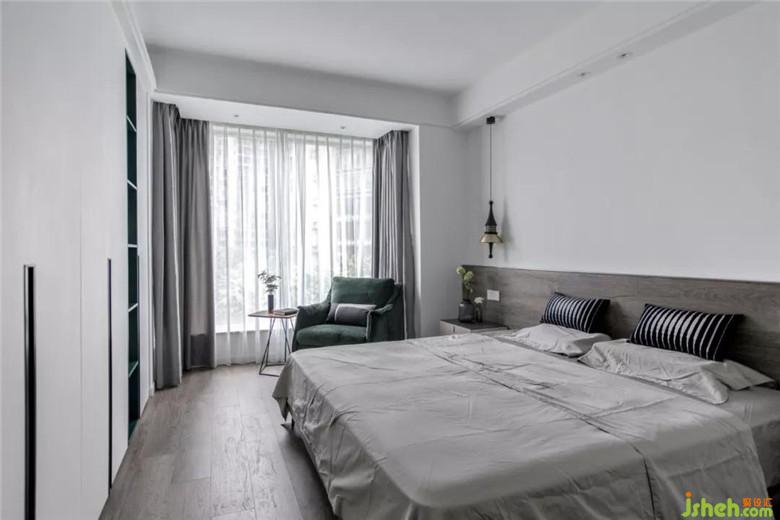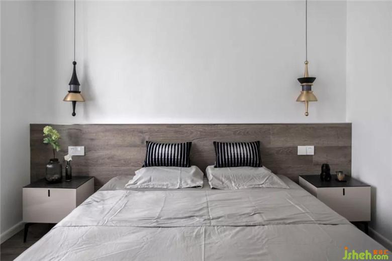 高雅自由的空間,充滿了唯美的想象,灰色加墨綠色的搭配,提升空間沉穩(wěn)度,黃銅色床頭燈不但跟墨綠色很搭,且增添了空間的復(fù)古氣息。原木色的床頭背景墻一方面保留了現(xiàn)代風(fēng)格的簡潔、自然,又增添了空間的層次感和溫潤靈動的尺度感。