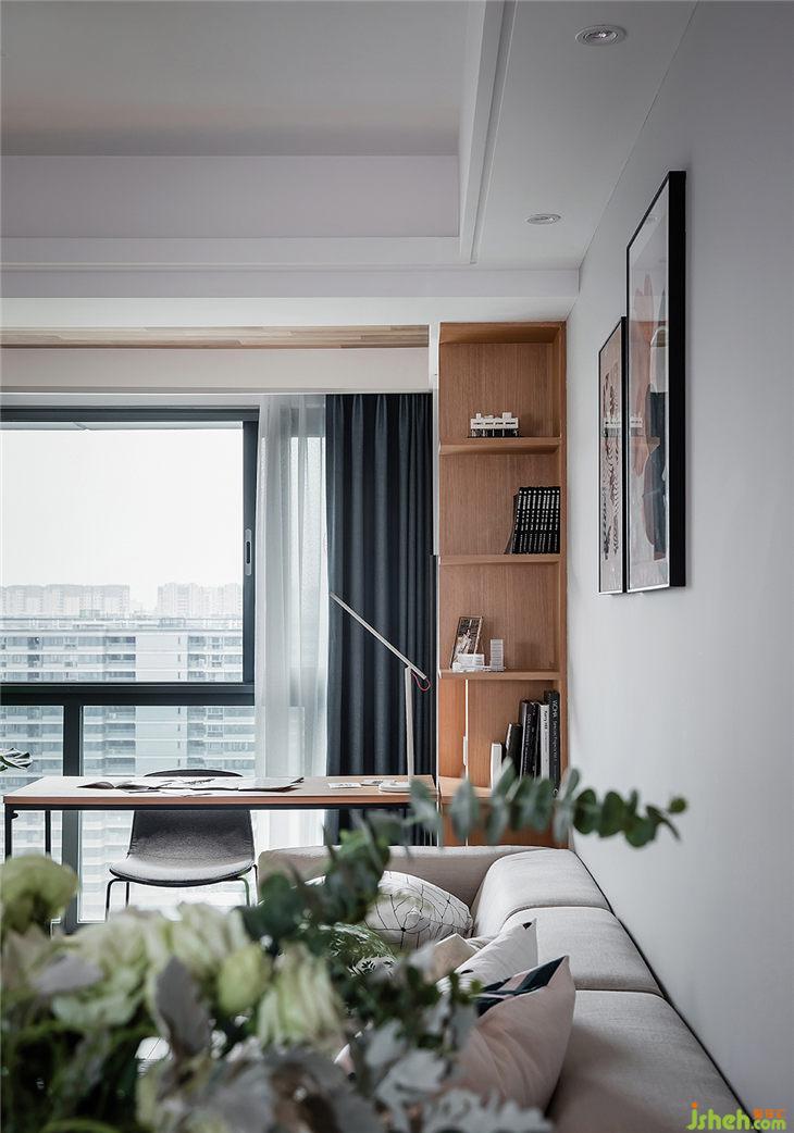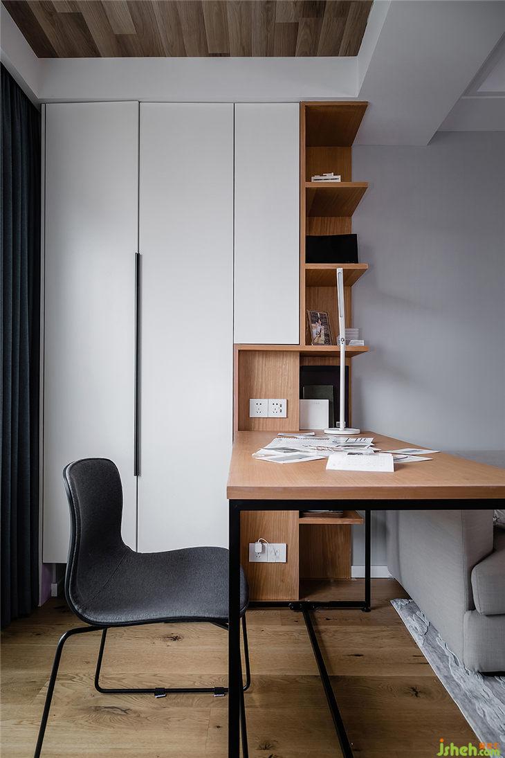 書(shū)桌是現(xiàn)場(chǎng)制作的,書(shū)桌一旁的開(kāi)放式書(shū)柜也是用KD板制作的。