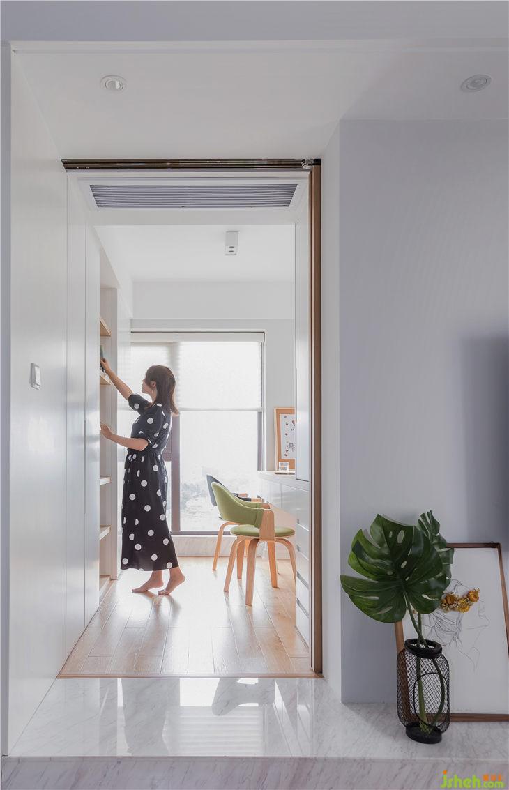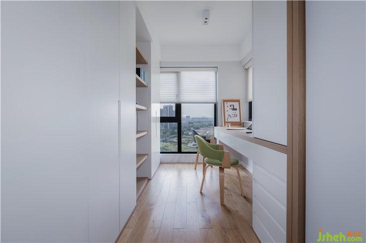 色彩上面以文藝白為基調,搭配地面原木色的實木地板,綠色布藝靠椅為整個空間增添了一絲活力,開放式的書架,白色在整個空間內一點也不無聊,硬軟裝的結合,流露出簡約的美感。