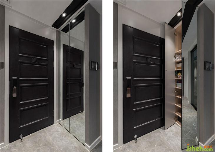 進(jìn)門(mén)左手邊的鞋柜是凸出廚房門(mén)的墻,采用鏡面門(mén)弱化了柜體,同時(shí)又能擴(kuò)大整體空間視覺(jué)感受!