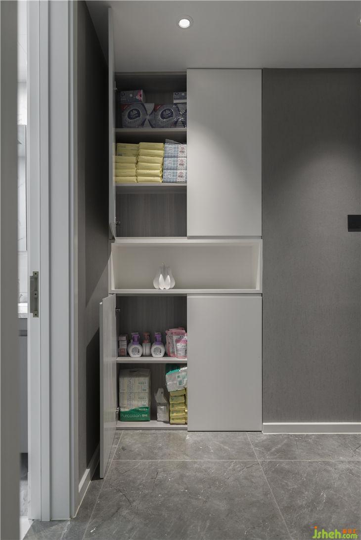 原客衛(wèi)的門(mén)是正對(duì)著進(jìn)戶門(mén)十分不好,因此把衛(wèi)生間門(mén)向左改動(dòng)。同時(shí)在右側(cè)做了90公分長(zhǎng)20公分深海柜收納柜,平時(shí)放一些常用的日用品。