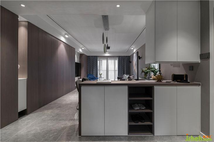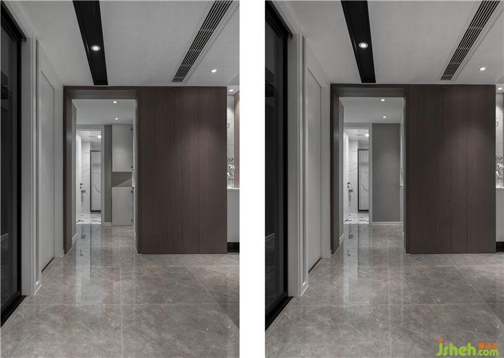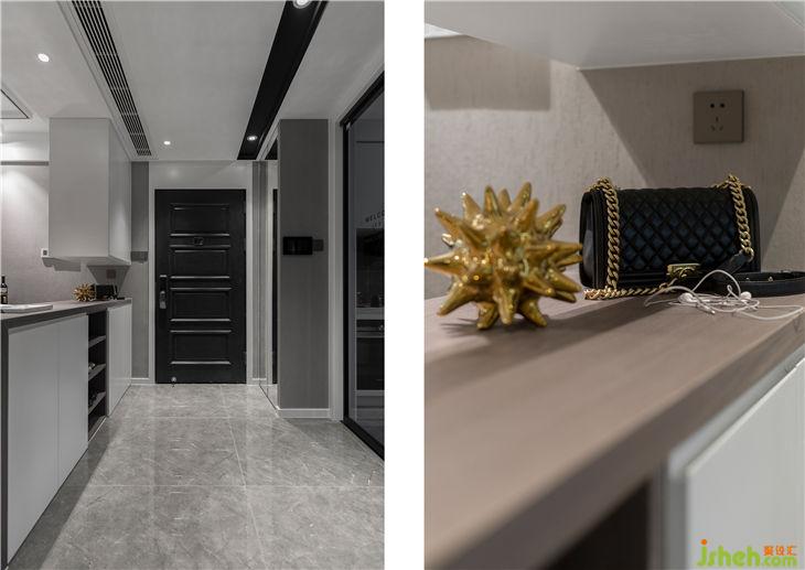 進(jìn)門(mén)右手邊是一排鞋柜和一個(gè)小吊柜。因?yàn)殡娞菰谶M(jìn)戶門(mén)邊上,考慮到出電梯的人直接能看到主臥室的門(mén),設(shè)計(jì)一個(gè)小吊柜可以遮擋視線的同時(shí),又可以增加餐廳用餐的私密性!