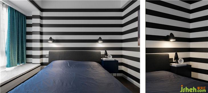 入戶門采用了隱形門的方式,黑白條紋墻面增加了視覺上的延伸性和空間的統(tǒng)一性。窗簾采用了亞麻布簾,通透了采光的同時也保證了自身的私密性。飄窗邊上的設備平臺也包進來做儲存柜,可以放些較大件的物品。