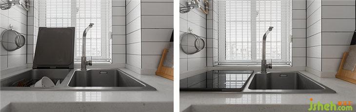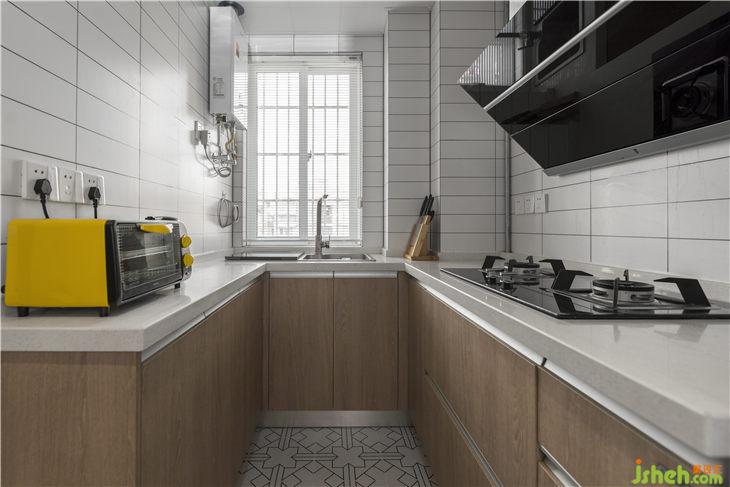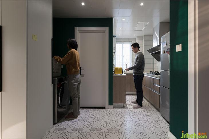 廚房和衛(wèi)生間原先的墻體拆除砌成薄墻,將現(xiàn)在進(jìn)入衛(wèi)生間的門洞封住,把廚房和衛(wèi)生間的區(qū)域分離開來,廚房變身U型廚房。這樣除了正常布局外,增加了一排窄的柜子放置小家電。