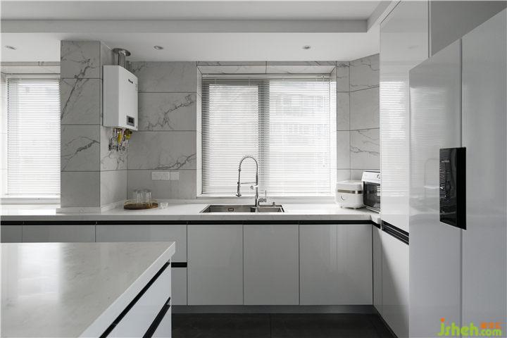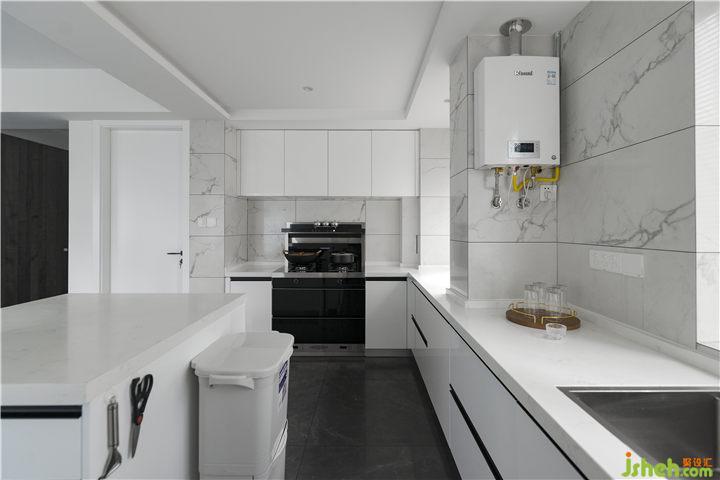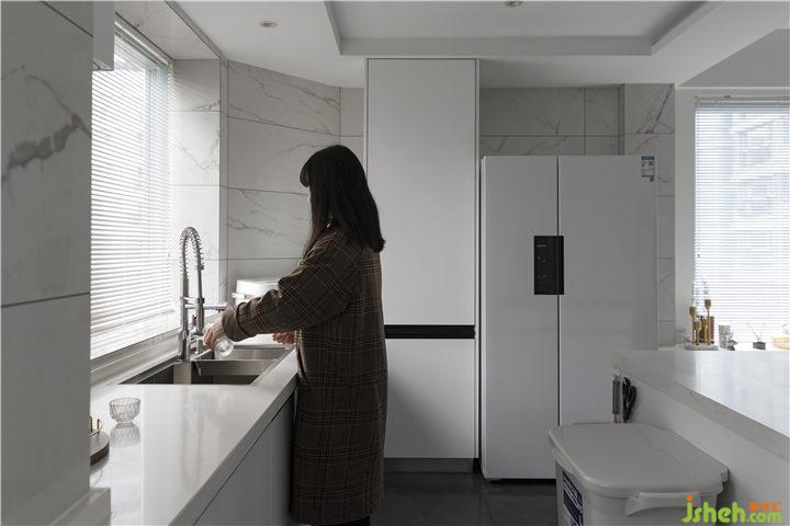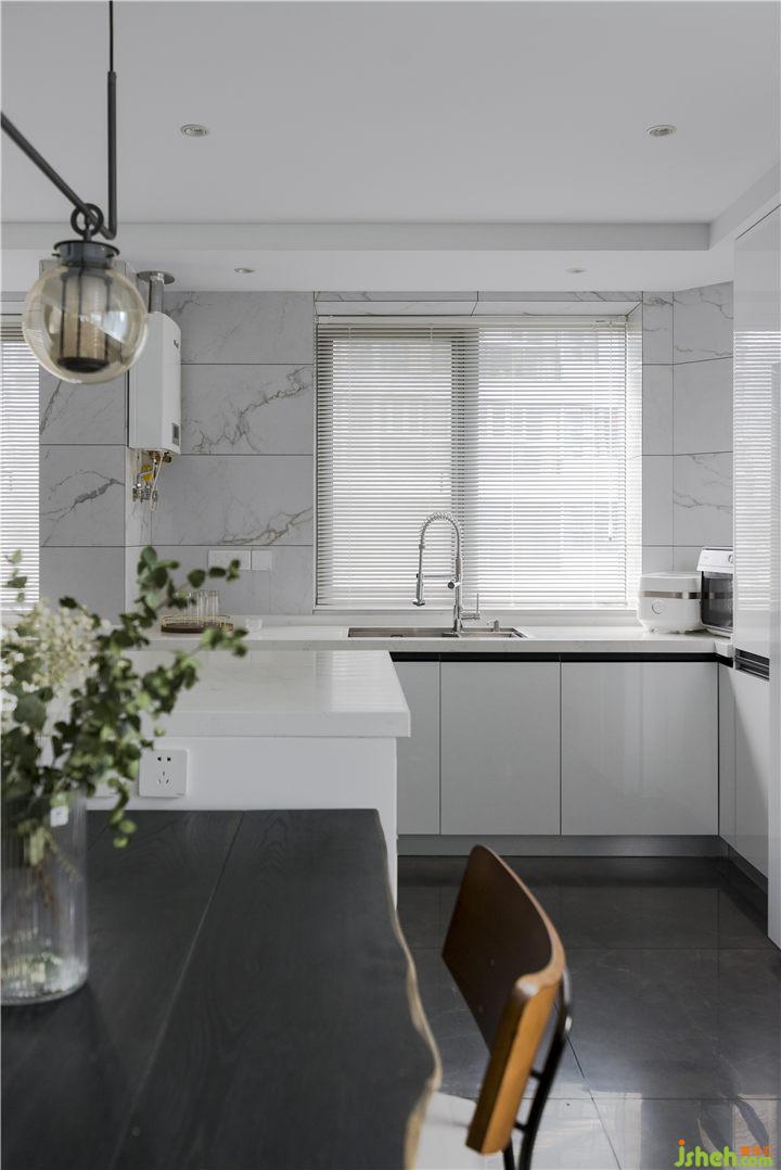 因為原廚房位于整個空間的中間位置,廚房到餐廳的生活動線很不方便,所以敲掉了小房間的墻,把北面的光線引入到戶的同時又擴大了廚房使用空間!讓廚房、餐廳、客廳成為一體,讓整個空間變得更加敞亮、光線通透。