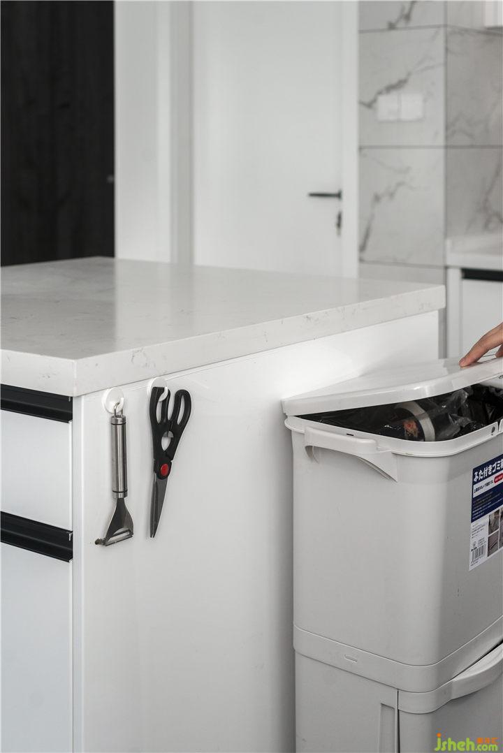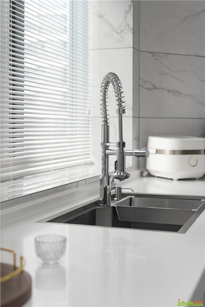 伸縮式水龍頭為屋主日常洗東西提供了很大的便利,同時常用的削皮工具放在垃圾桶旁會讓我們需要操作的時候更加順手!