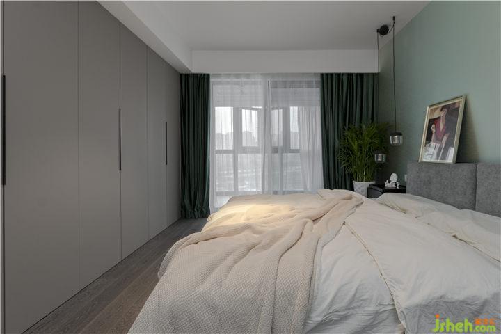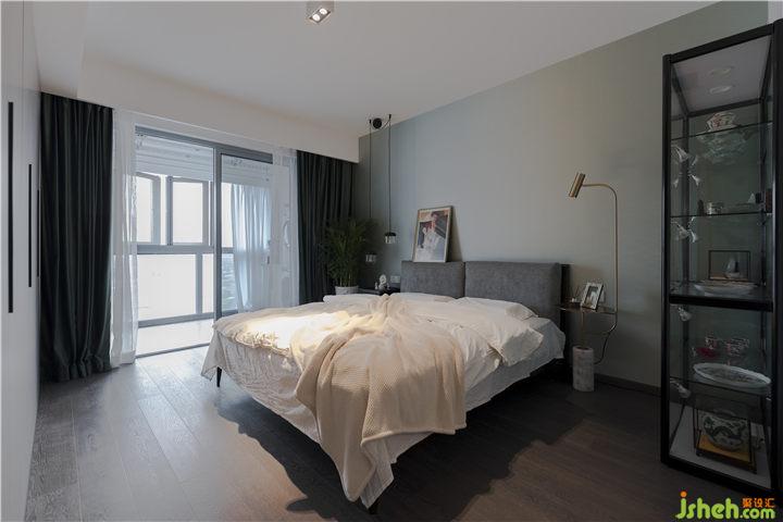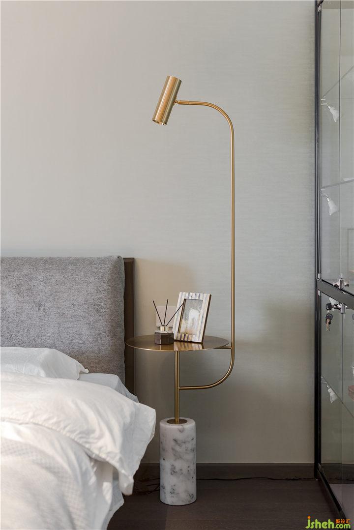 靜謐的色調(diào),賦予了空間寧?kù)o的氛圍。黃銅落地架綴,復(fù)古綠窗簾做為空間的亮色調(diào)。