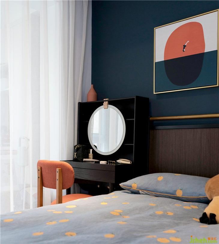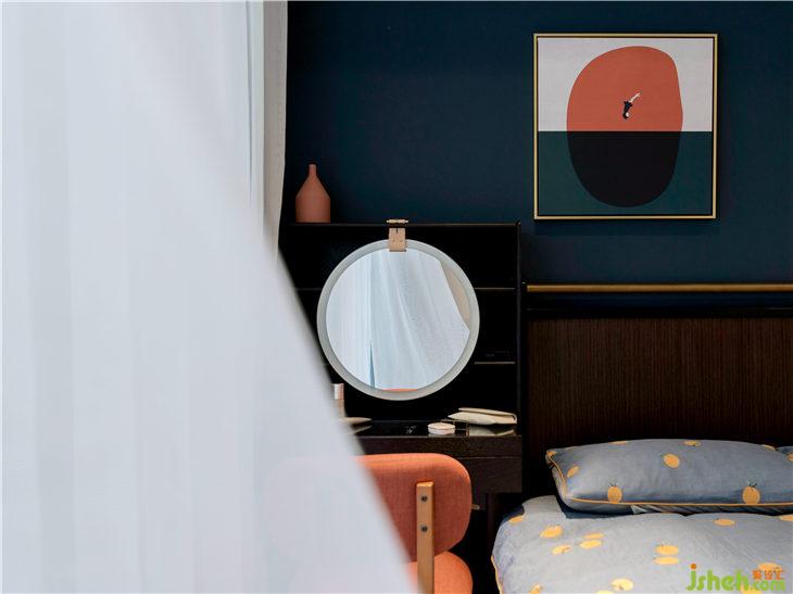 屋主在前期告知設(shè)計師較喜歡橘色,因此主臥在整體用色上以深藍(lán)色為主,橘色為輔,紅色為點(diǎn)綴色。讓整體空間個性時尚的同時不失有趣味!