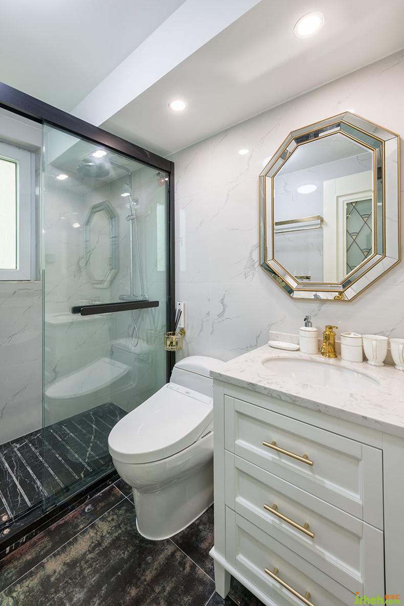 衛(wèi)生間在白色主調(diào)中加入金色的小裝飾,為呆板的空間增添了一點兒俏皮。深圳設(shè)計公司
