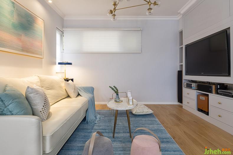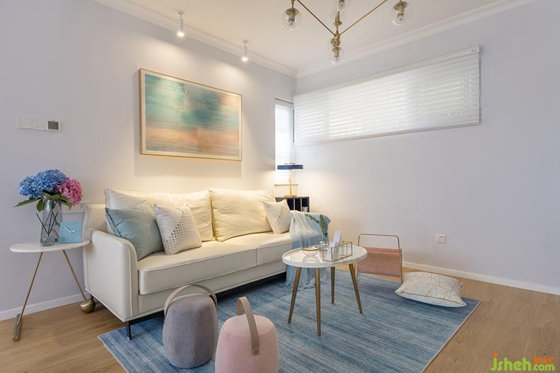 純白的百葉窗簾巧妙地過濾了自然光線,使空間更加通透明亮。工藝感十足的吊燈,溫馨的純色布藝沙發(fā),小小的客廳,幸福的溫度脈脈而生。