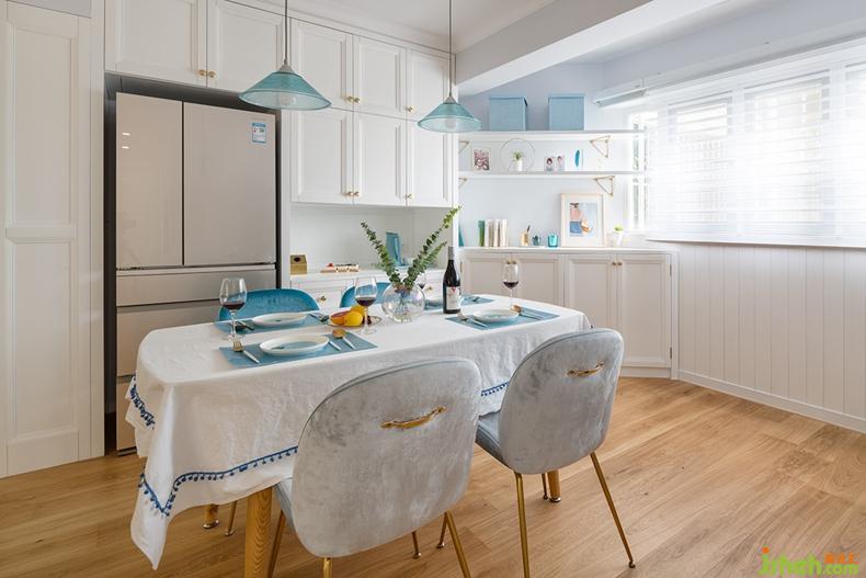 室內(nèi)設(shè)計(jì)師把陽臺(tái)封窗做成書桌,擴(kuò)延到餐廳,使餐廳整體面積變大。玻藍(lán)餐燈與銀灰餐椅相映,在米白色柜櫥的背景下給人的感覺是明亮又有色彩感的。