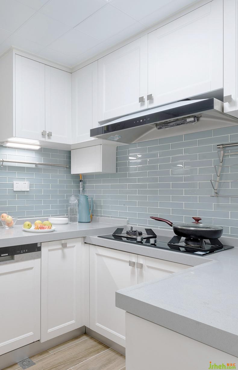 通透的玻璃磚做廚房墻色,使小空間透出高雅精致的光澤感,更顯整潔明亮。純色一體式壁櫥上下排布,將空間利用拓展成三維,方便于勞作時取物。室內(nèi)設(shè)計師