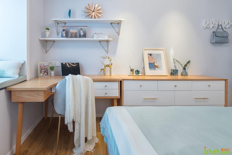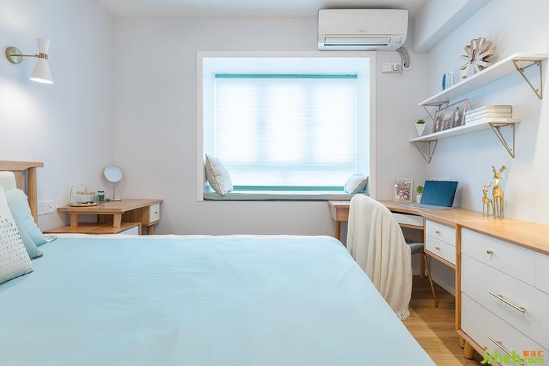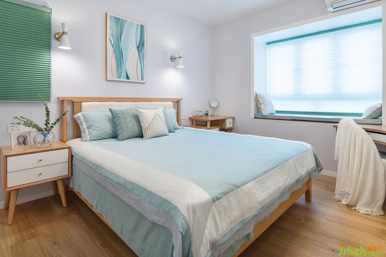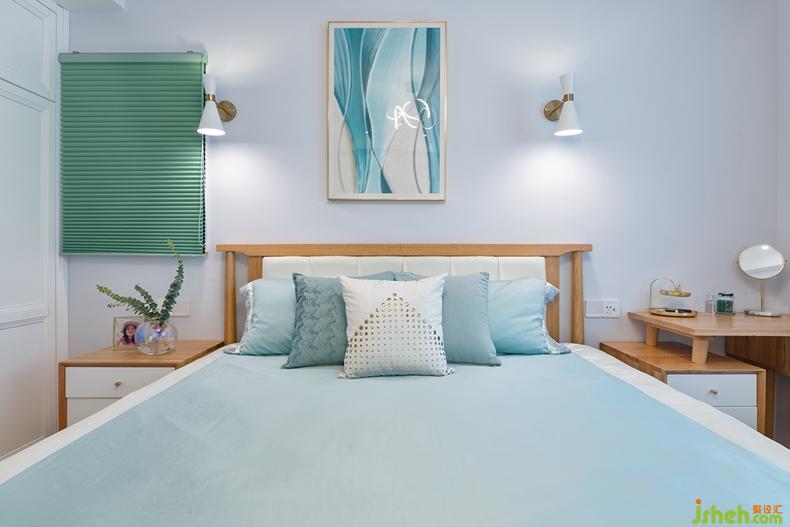 玻藍色的床品與窗簾、裝飾畫的顏色融為一體,這一抹純凈的藍為臥室披上一層溫暖繾綣的外衣,實木的肌理,內(nèi)斂的祖母綠,流露著臥室的靜。