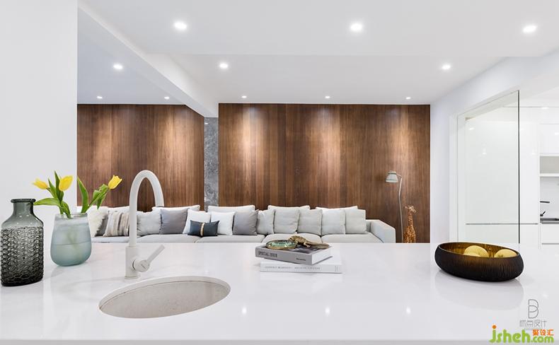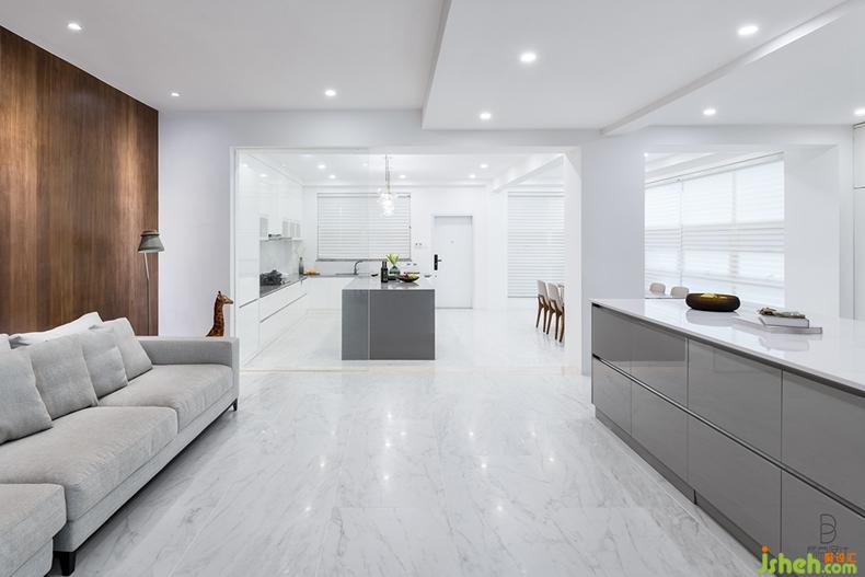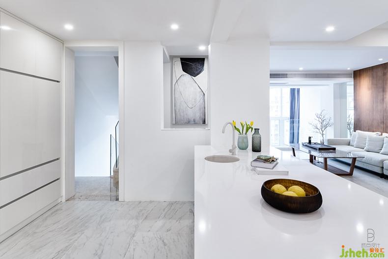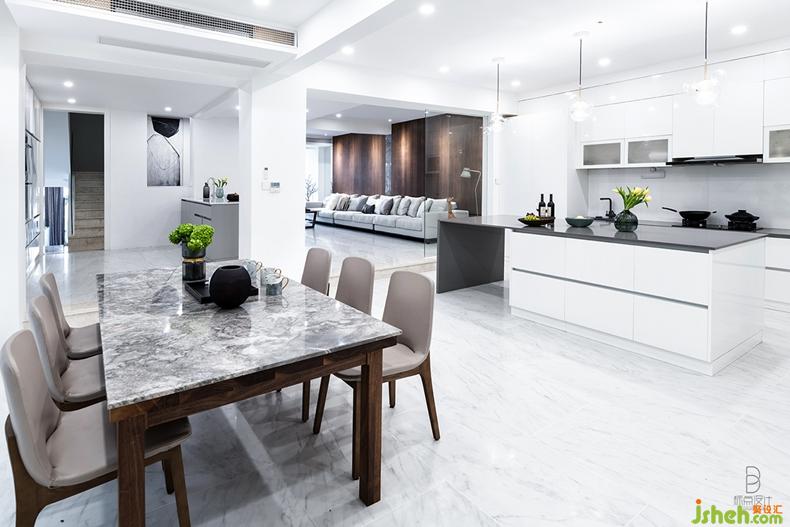 開放式餐廳將烹飪與用餐空間合二為一,成為最具生活滋味的區(qū)域。略帶暖意的大象灰結(jié)合純透的白,裝飾櫥柜、餐桌,打造出清雅立體的視感。