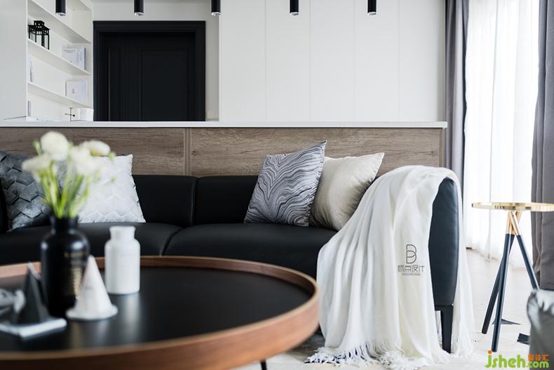 室內設計師將黑色運用到圓幾、沙發(fā)、地毯甚至花瓶中,起到點綴效果,增加藝術質感。同時幾何圖形拼接的真皮地毯為空間增添了質感