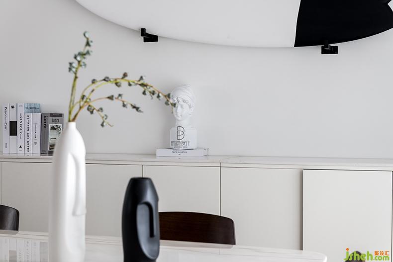 小巧精致的黑白花瓶、石膏人像裝飾為空間增添了柔和的女性氣質。墻面又以男主人的愛好沖浪板來裝飾,凸顯出主人對自由和個性化的追求。小株植物更為房間增添了色彩和自然氣息。