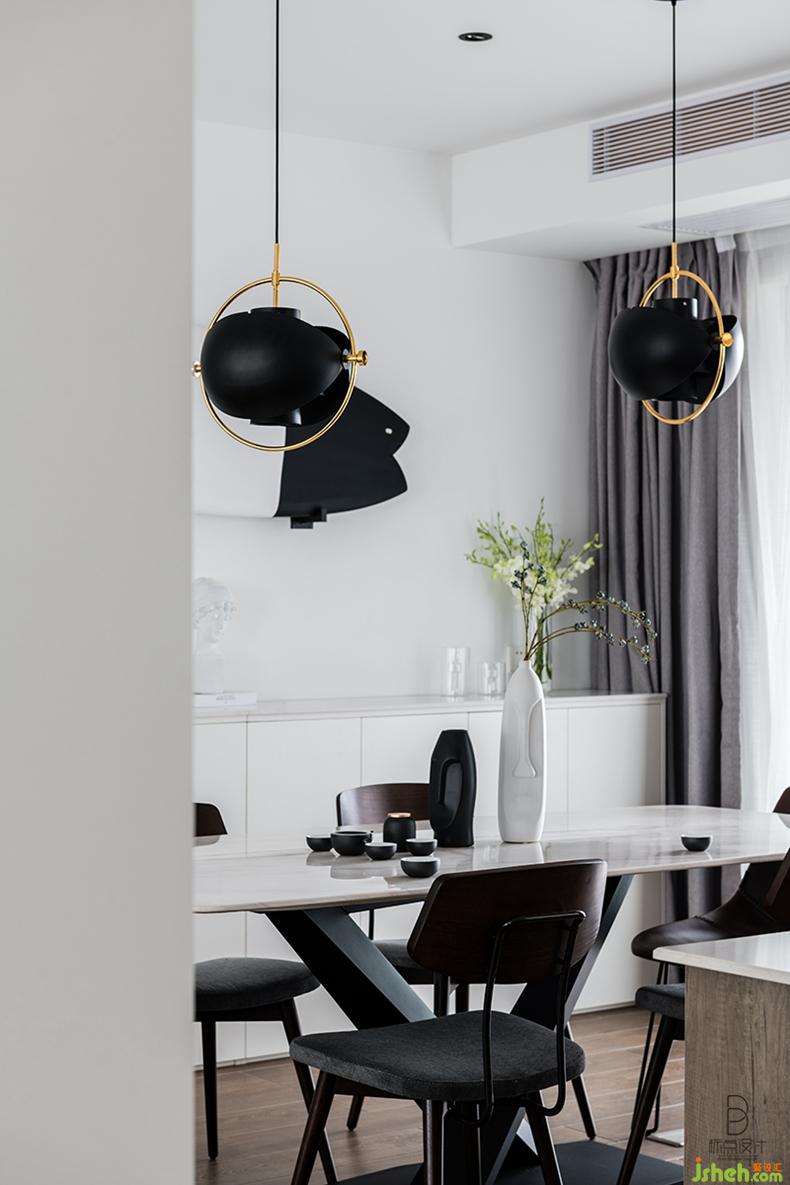 餐廳與客廳保持一致風格,兩盞獨具特色的吊燈搭配棕色椅子、純白餐桌,簡潔大方,充滿了怡人的氛圍。寬大窗戶引入自然光,室內設計師讓整個空間看上去更加清爽敞亮。
