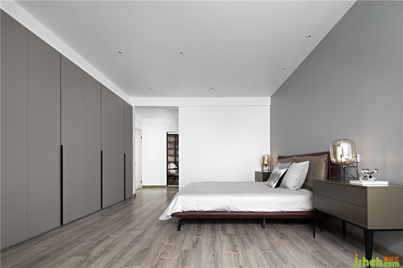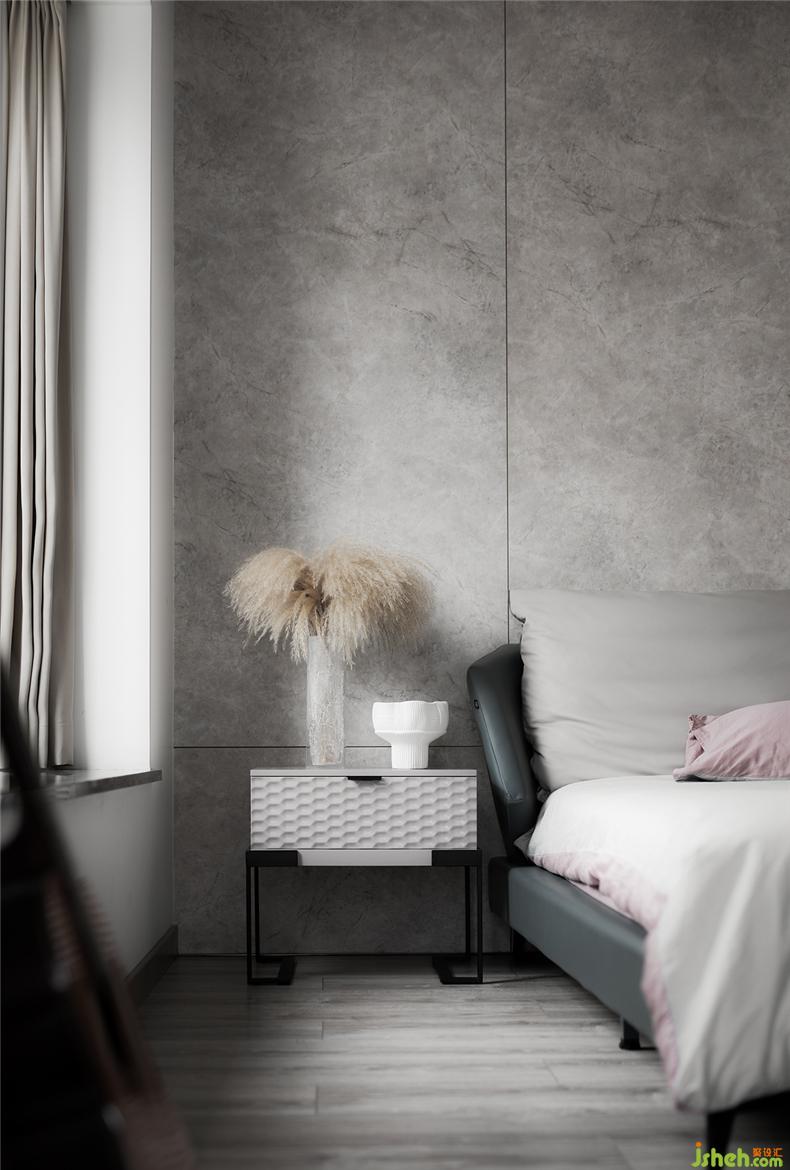 床頭墻面我們選擇了淺灰色與床尾衣柜顏色相呼應(yīng),