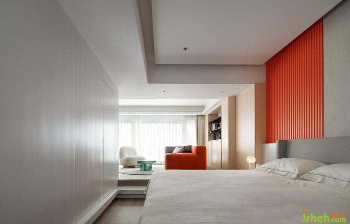 灰與白的空間加入一抹橙色,讓臥室不沉悶;床頭背景墻做了上下分段并暗藏燈帶,天花也做了懸浮吊頂和暗藏燈帶。